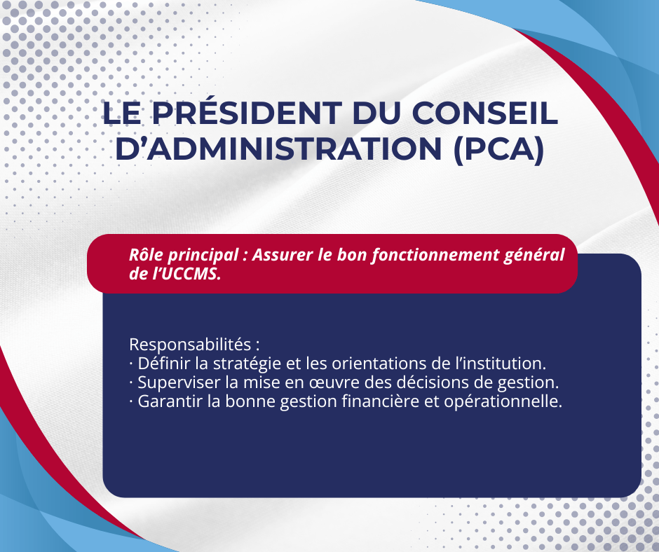 Bienvenue sur la page des élus de l'UCCMS, où nous mettons en lumière les leaders qui façonnent l'avenir de notre institution. Ces personnalités engagées jouent un rôle essentiel dans la gouvernance et le bon fonctionnement de l'UCCMS, chacun avec des responsabilités spécifiques qui garantissent la transparence, la conformité et l'efficacité de nos opérations.